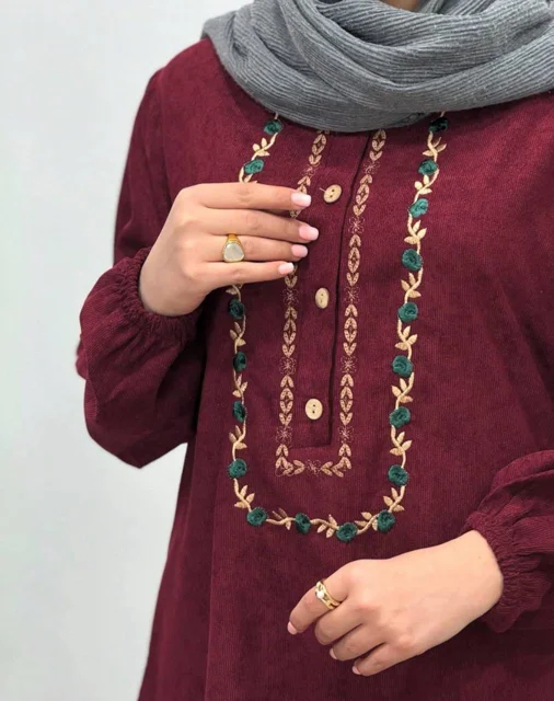 قسمت یقه و آستین گلدوزی داره که خیلی قشنگ و شیکه